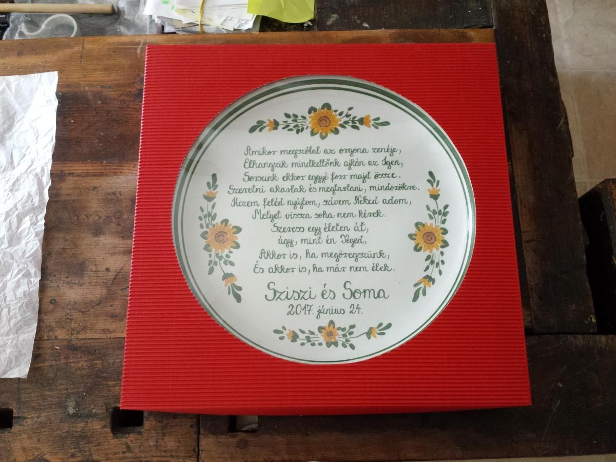 Pizzás tányér esküvőre napraforgós motívummal, díszdobozban